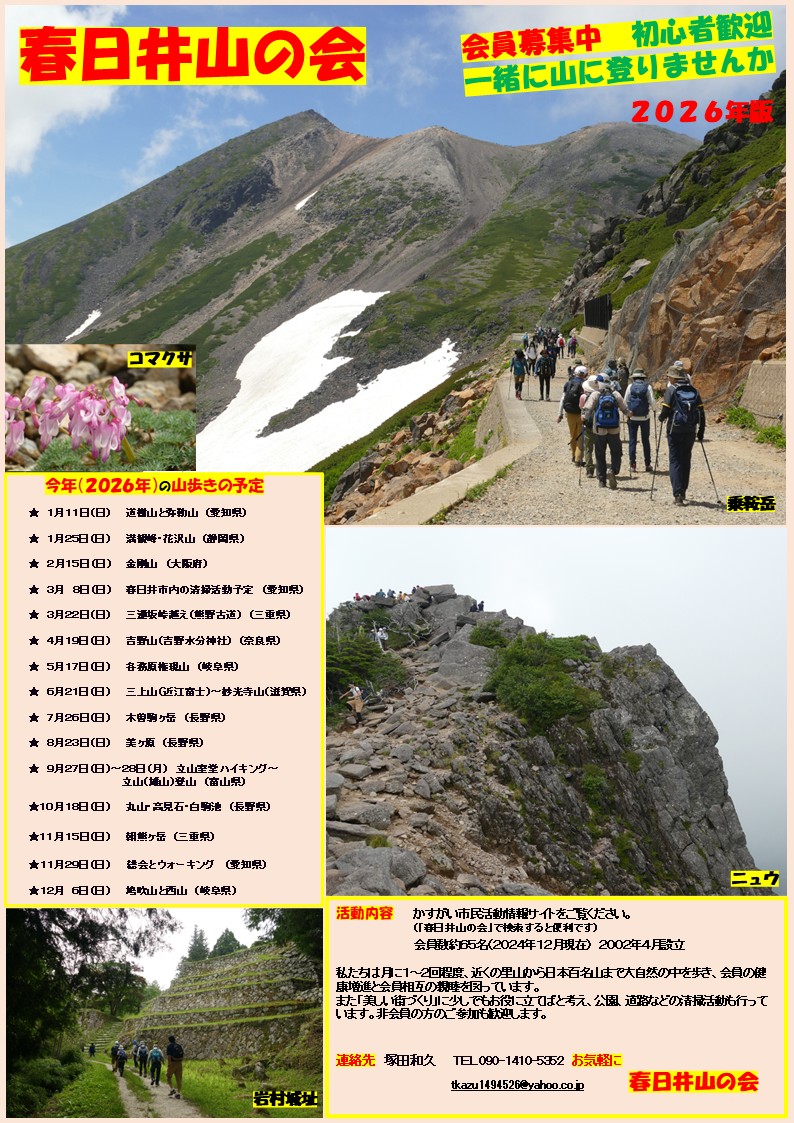 ○「春日井山の会」は会員の健康増進と会員相互の親睦を図るとともに、その活動を通じて奉仕活動と福祉の増進を図り、地域社会の発展に努めることを目的としています。(2002年4月設立)