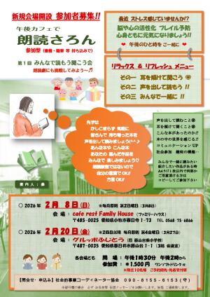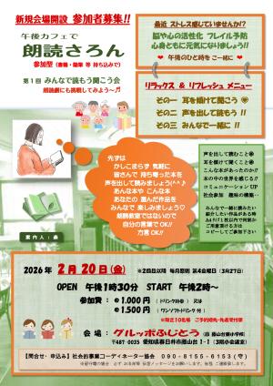 お知らせ公開日:2025年12月20日新規会場開設 参加者募集!!2025年4月から開始した"午後カフェで朗読さろん”が好評で新しく開催会場を増やしました。