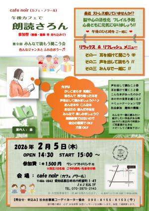 お知らせ公開日:2025年12月20日"午後カフェで朗読さろん”見学受付中!ただいま開催中の"午後カフェで朗読さろん”の見学申し込みを受け付けておりますのでお気軽にご連絡くださ...
