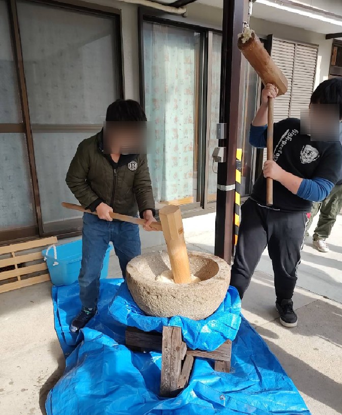 同時進行で、餅つき機を使って、のし餅も作ります。のし餅は、お雑煮用にカットして、持ち帰りできます。(名古屋のお雑煮には、角もちが入っています)