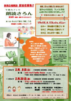 公開日:2025年12月20日団体からのお知らせ社会的事業コーディネーター協会新規会場開設 参加者募集!!2025年4月から開始した"午後カフェで朗読さろん”の新設会場グルッポふじとうのご案内チラシです。